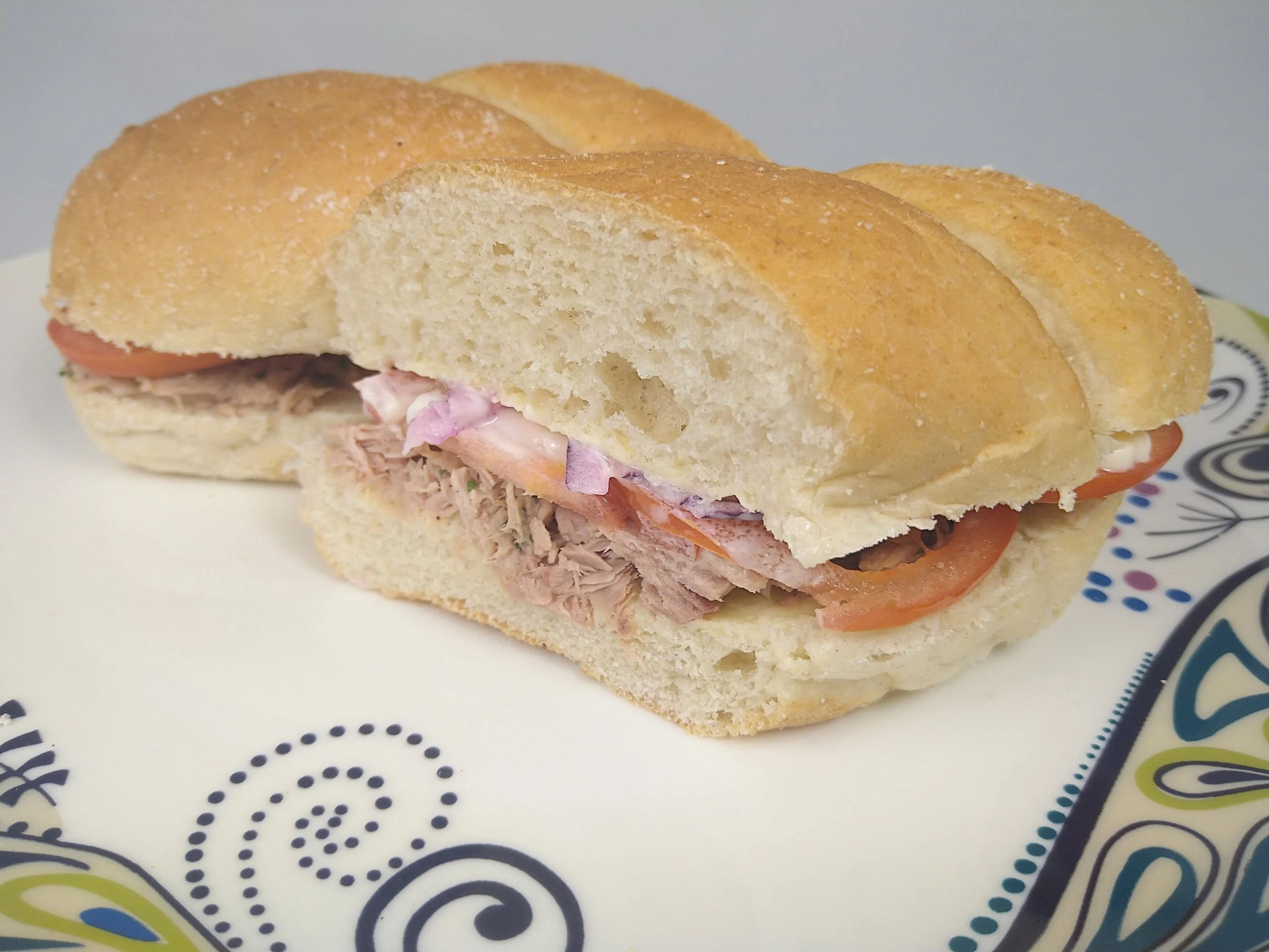 Next, assemble your sub. Spread the tuna across the bottom half of the sub. Lay the tomato slices on top of the tuna, then place the onion rings on top of the tomatoes. Spoon or squeeze the mayonnaise across the top of the filling. It’s up to you how much mayonnaise you use, but I tend to be quite generous with mine.