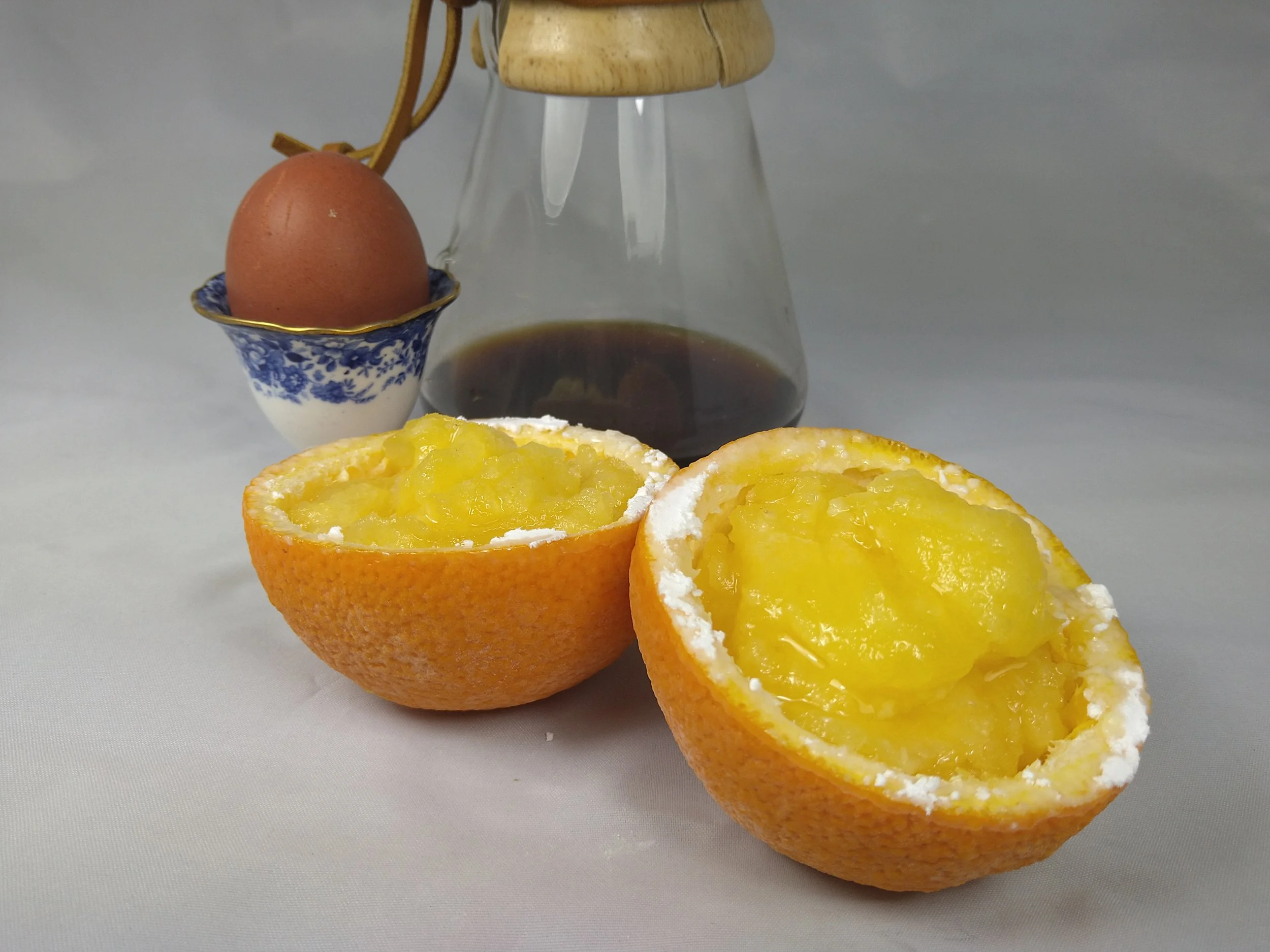 If you squeezed the juice out of a fresh orange, while the liquid is simmering, carefully remove the remaining flesh and pith from the skin of the orange. Rinse the orange ‘shells’ and put to one side.