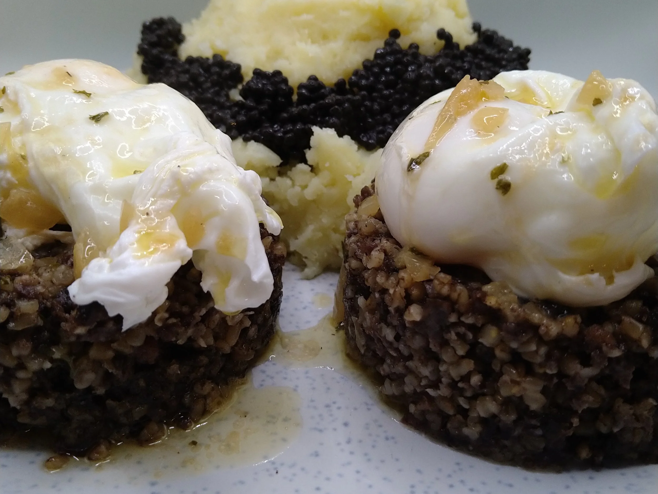 If desired, fashion a dome of mashed potato on each plate and surround with caviar.